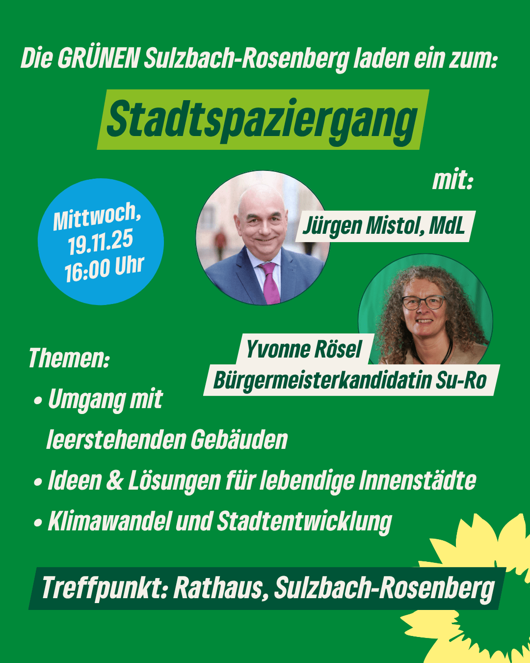 Darüber wollen wir beim Stadtspaziergang mit dem Landtagsabgeordneten Jürgen Mistol und Bürgermeisterkandidatin Yvonne Rösel sprechen. Gemeinsam werfen wir einen Blick auf aktuelle Herausforderungen und mögliche Lösungen für ein nachhaltiges Leerstandsmanagement und eine klimafreundliche Stadtentwicklung.